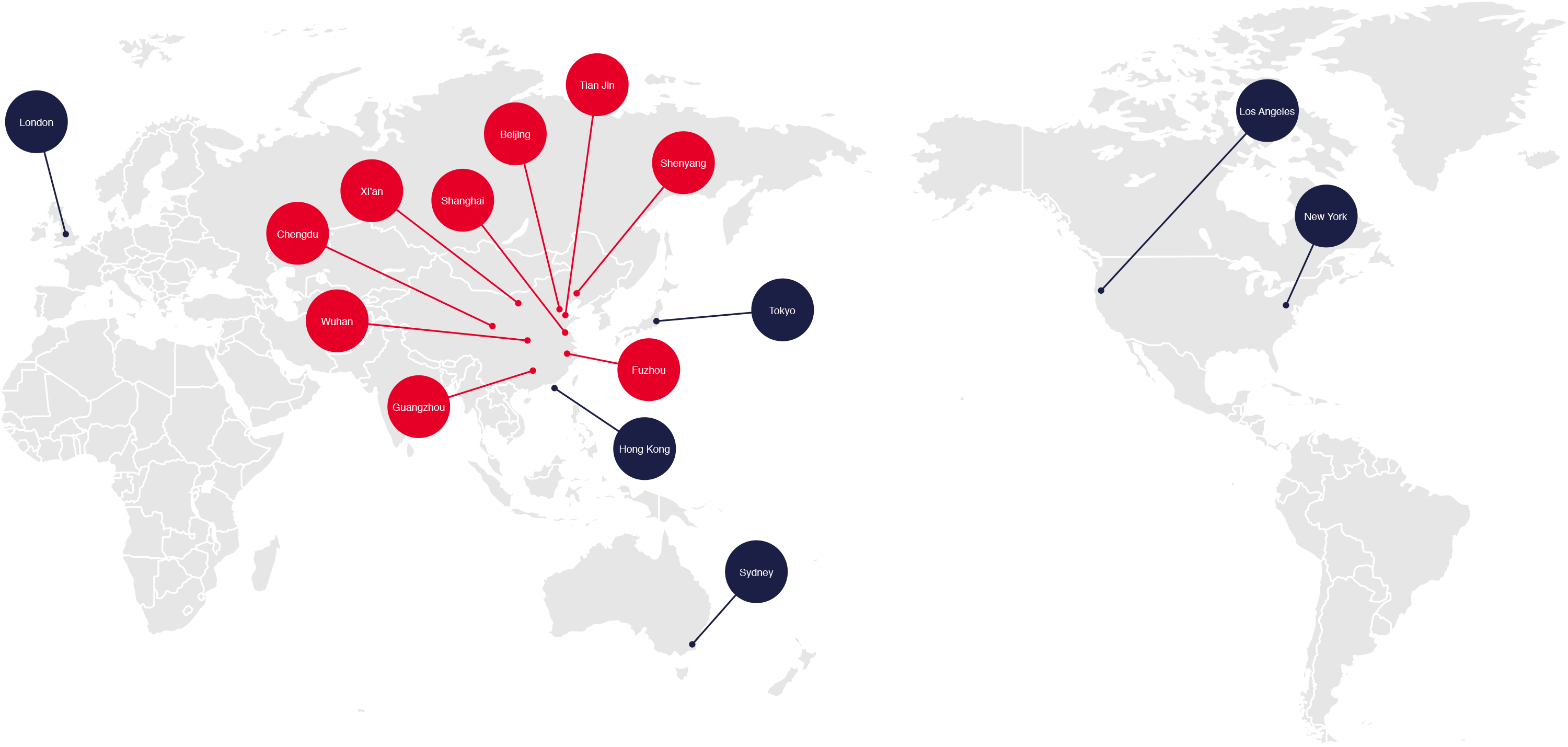 Beijing, Tianjin, Shenyang, Shanghai, Wuhan, Fuzhou, Guangzhou, Xi’an, Chengdu